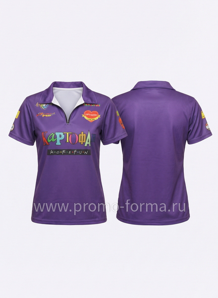 Цена высылается по запросу и зависит от количества изделий в партии.Для презентации бренда в торговых центрах Москвы наш швейный цех пошил женское поло в насыщенном фиолетовом оттенке. Образ подчёркивает фирменную палитру и сразу выделяет промо команду среди потока посетителей.