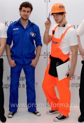 На фотографии представлены два костюма, созданные на нашем швейном производстве для промоутеров, работающих на выставке в строительной тематике.