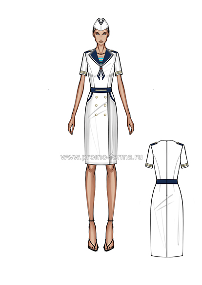 - Круизный стюард/стюардесса: приталенное платье или жилет и юбка, платок, нагрудный знак; мягкие на ощупь ткани, стойкое нанесение логотипа.