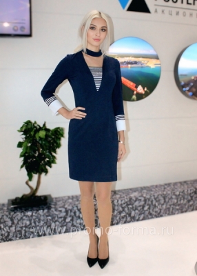 Модель в морском стиле: глубокий темно‑синий цвет, полуприлегающий силуэт, длина до колена. V‑вырез с трикотажной вставкой «тельняшка» подчеркивает линию груди.