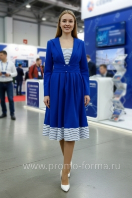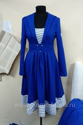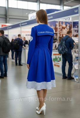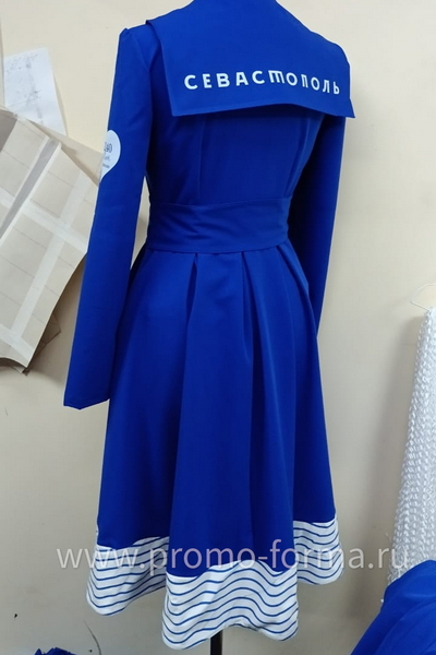 Цена высылается по запросу и зависит от количества изделий в партии.Наш швейный цех изготовил это промо‑платье в морском стиле для промо‑моделей на выставку "Россия" на ВДНХ. Команда представляла регион Севастополь, поэтому силуэт и отделка выдержаны в эстетике флотской формы.