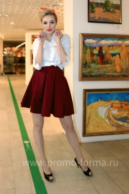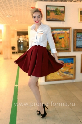 Цена высылается по запросу и зависит от количества изделий в партии.Промо‑костюм в духе pin‑up и стиляг 50‑х, винтажного стиля: белая рубашка, завязанная узлом на талии, и пышная бордовая юбка‑солнце выше колена. Высокая посадка и A‑силуэт подчёркивают талию, а летящий подол добавляет динамики и лёгкости образу.