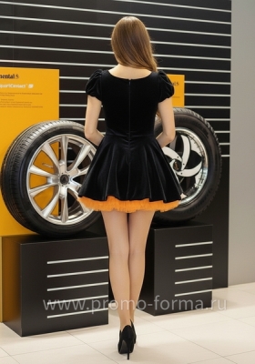 Цена высылается по запросу и зависит от количества изделий в партии.Наш швейный цех изготовил это винтажное платье для хостес на выставку: промо одежда в стиле pin‑up и ретро 50‑х, которая мгновенно притягивает внимание. Силуэт подчеркивает талию: приталенный бархатный лиф с квадратным вырезом и рукавами‑фонариками сочетается с объемной юбкой‑солнце мини.