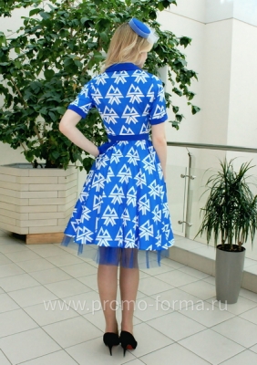 Цена высылается по запросу и зависит от количества изделий в партии.Наш швейный цех изготовил это промо платье для девушек на выставку. Модель в стиле pin‑up и New Look 50‑х: приталенный лиф с V‑вырезом и отложным воротником, короткий рукав и акцентный пояс. Ярко‑синий цвет с фирменным белым геометрическим принтом выгодно подчеркивает корпоративную айдентику.